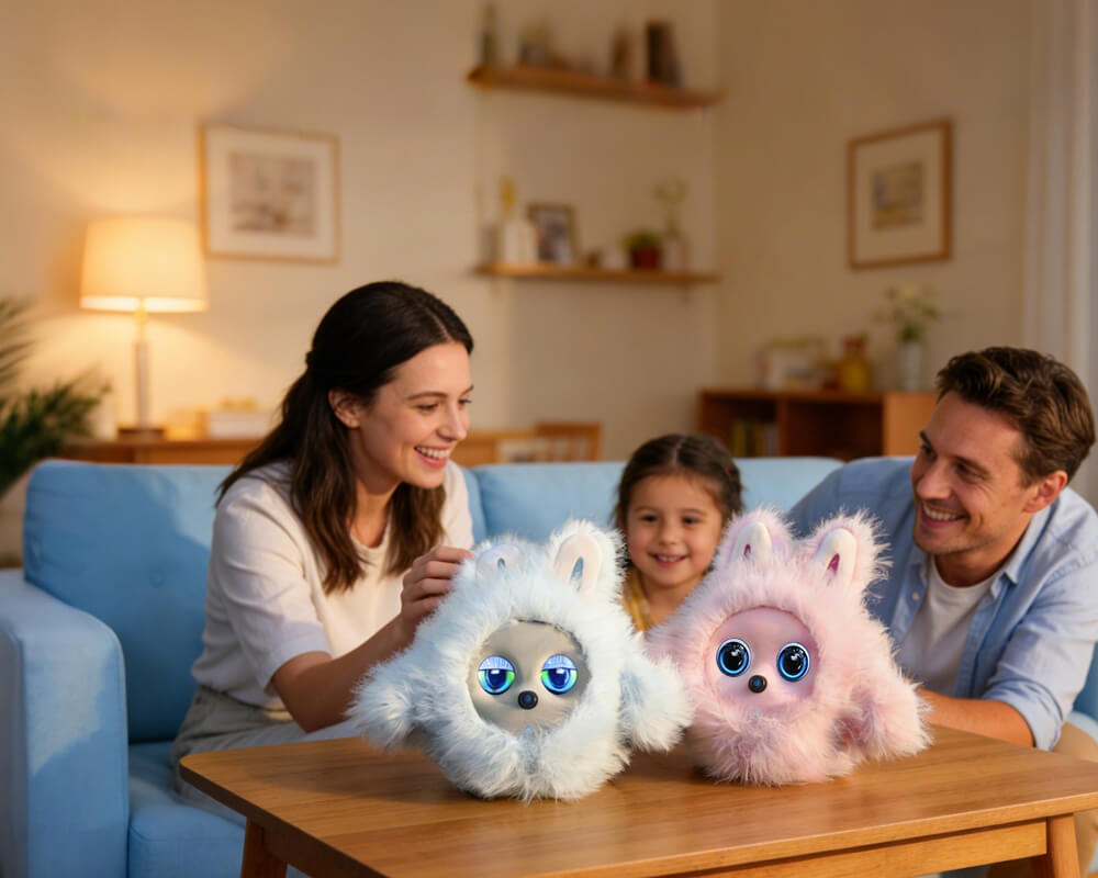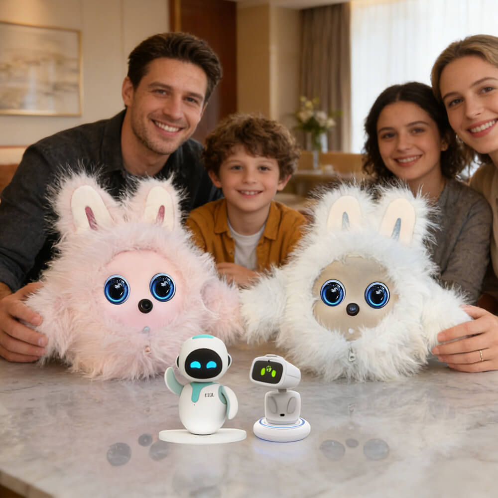 This desktop electronic pet features intelligent voice and touch interaction for
